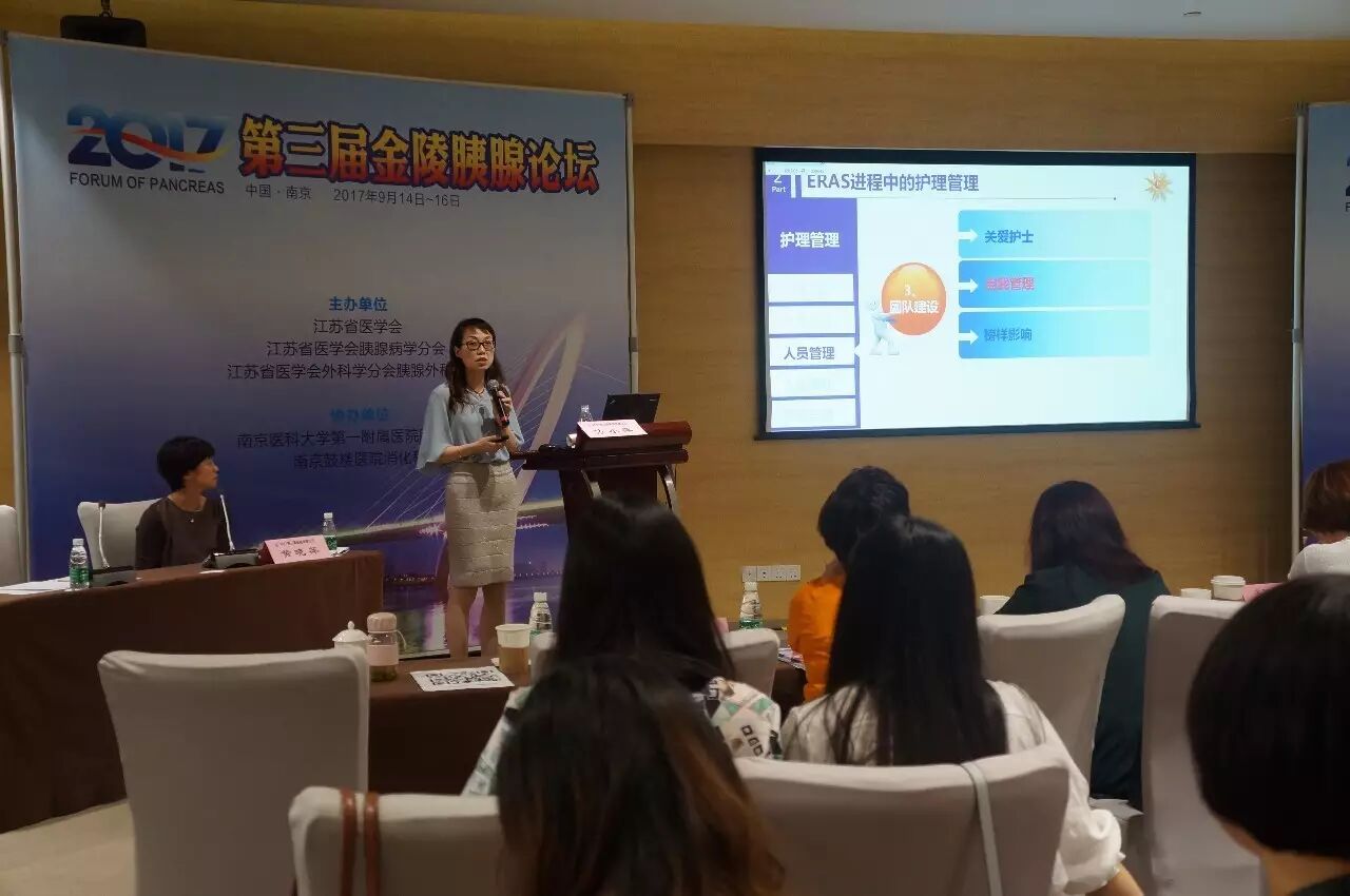 本次大会特设护理分会场,主题为“ERAS的护理质量管理及胰腺护理病例讨论”。 上海长海医院胰腺肝胆外科的黄建业护士长、南京医科大学第一附属医院护理部顾则娟主任、江苏省级机关医院护理部的莫永珍主任参加了本次会议并作精彩发言,南京医科大学护理学院副院长许勤教授、南京医科大学第一附属医院医技片科护士长黄晓萍主任、外科片科护士长袁慧主任作为特邀主持,和东道主胰腺中心方小萍护士长共同主持了本次活动。